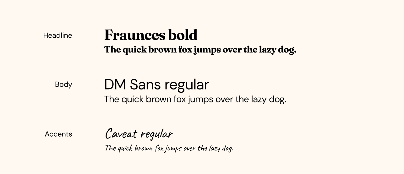 This type system pairs expressive, editorial headlines with highly readable body copy. Fraunces adds character and confidence, DM Sans ensures clarity and accessibility across everyday use, and Caveat brings a subtle handwritten warmth for emphasis.