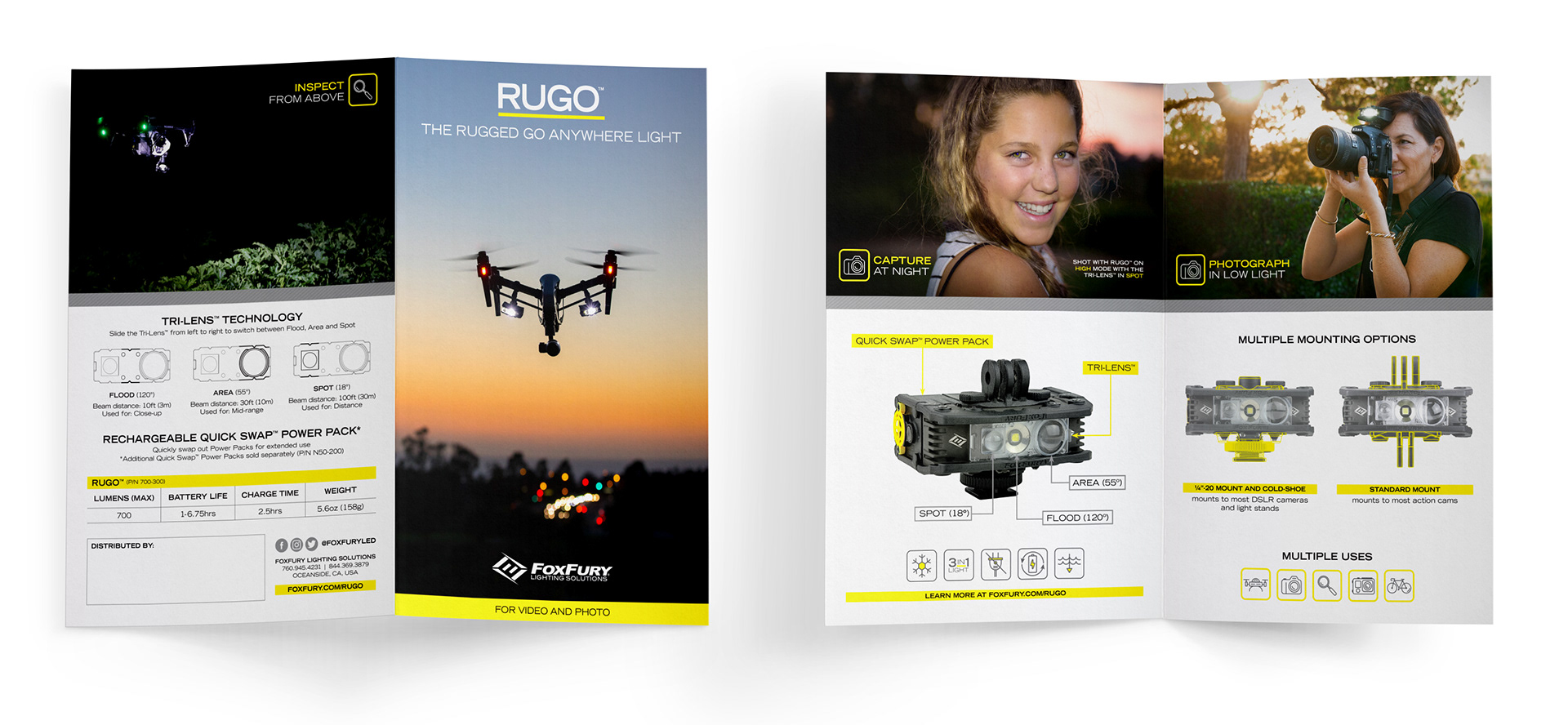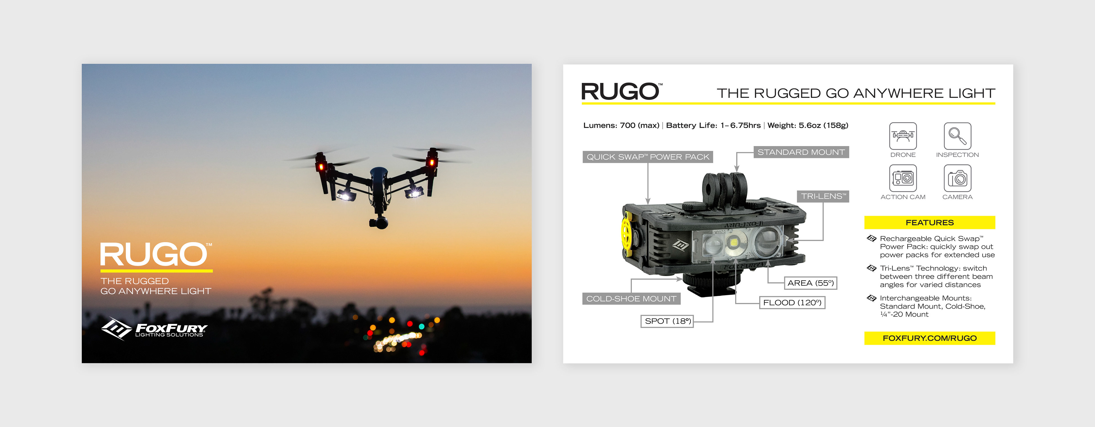 When the FoxFury Rugo™ launched in 2015 as one of FoxFury’s newest products, there was a need for premium packaging and branded collateral. This was FoxFury’s first jump into the photography and drone market and it needed to make a big splash. We needed to create standout packaging, manuals, and collateral that would work in both the consumer and industrial markets.
